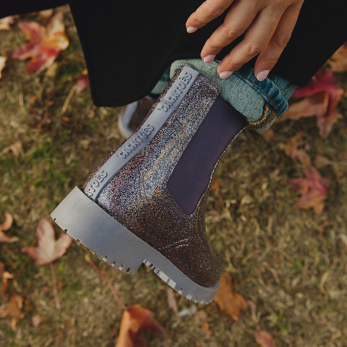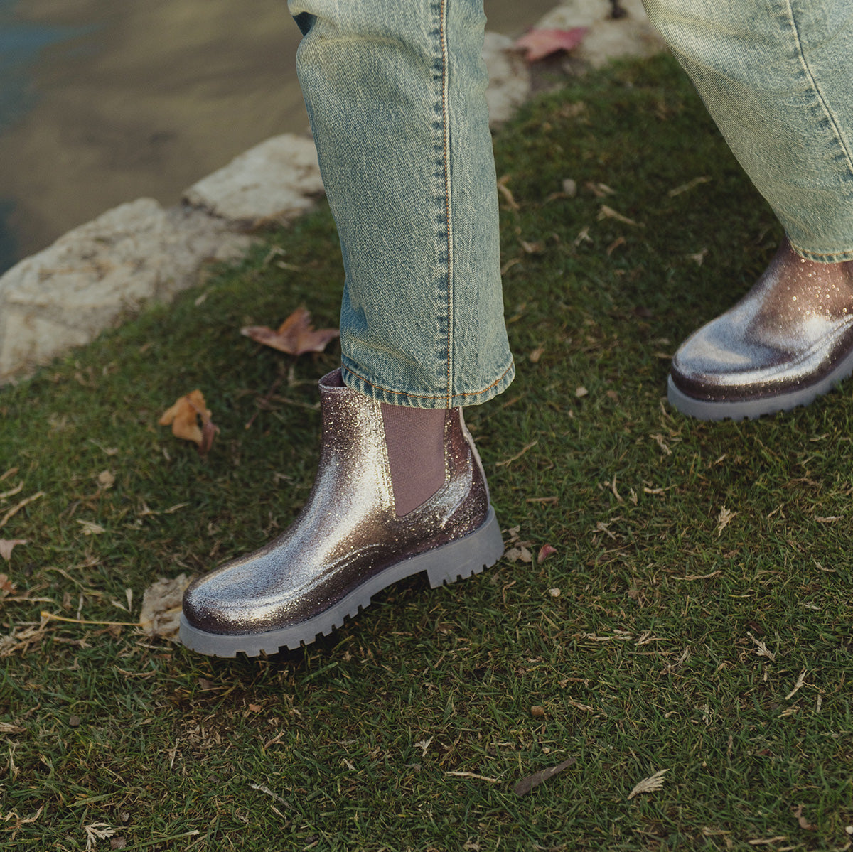 Avec nos bottes à paillettes violettes, la pluie devient une occasion de briller !